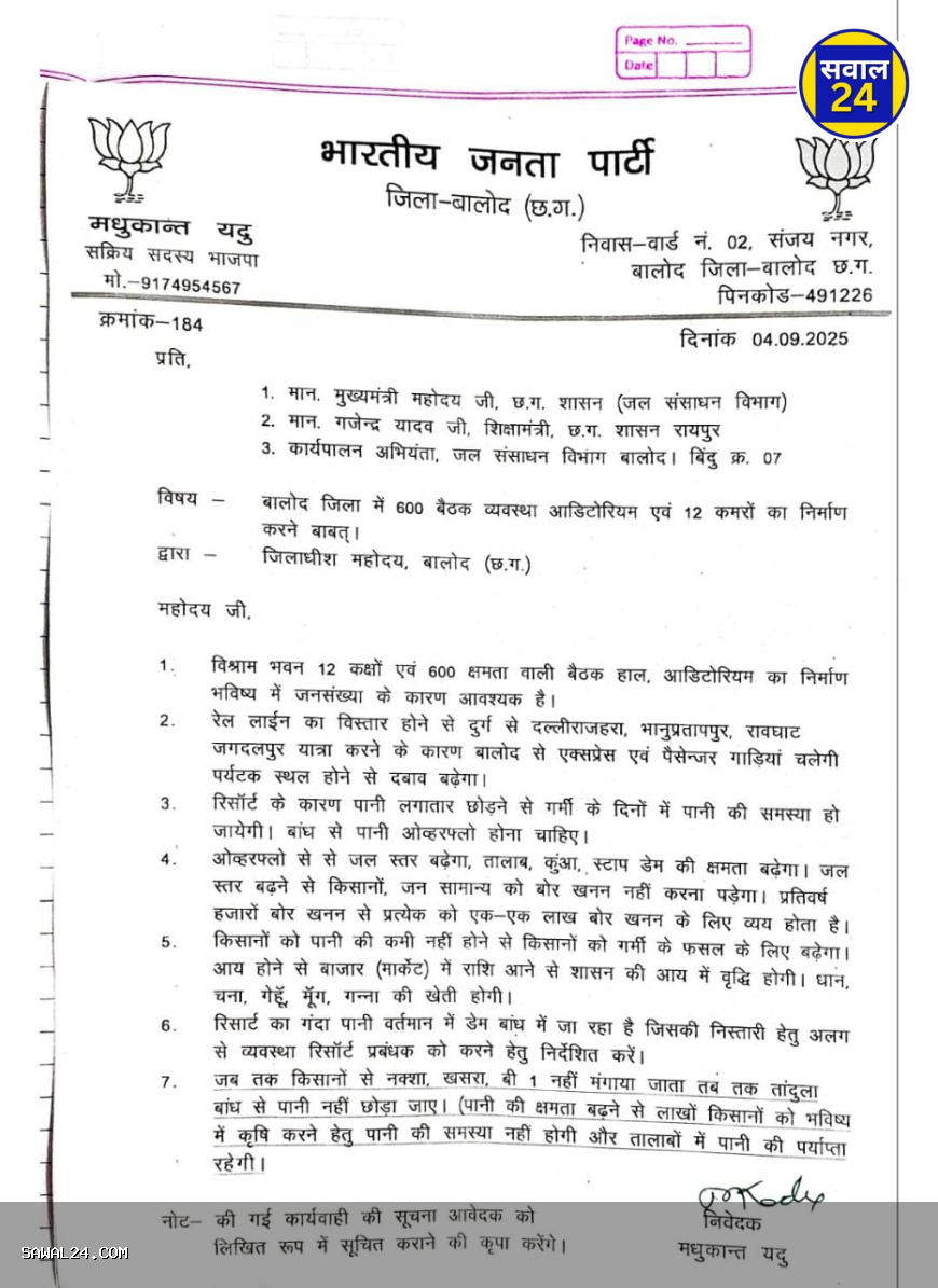 ज्ञापन में यह भी आरोप लगाया गया है कि रिसॉर्ट से निकलने वाला गंदा पानी सीधे जलाशय में गिर रहा है। यह स्थिति केवल किसानों के लिए ही नहीं, बल्कि संपूर्ण बालोद शहर के लिए भी खतरे का संकेत है। शहरवासी इसी जलाशय पर निस्तारी के लिए निर्भर हैं।