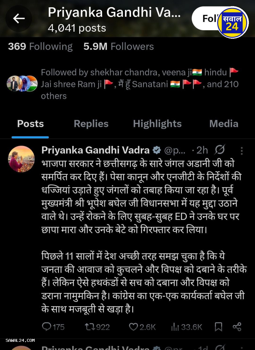 पूर्व मुख्यमंत्री भूपेश बघेल के बेटे की गिरफ्तारी के बाद प्रियंका गांधी वाड्रा का ट्वीट अडानी बना केंद्र बिंदु ,,