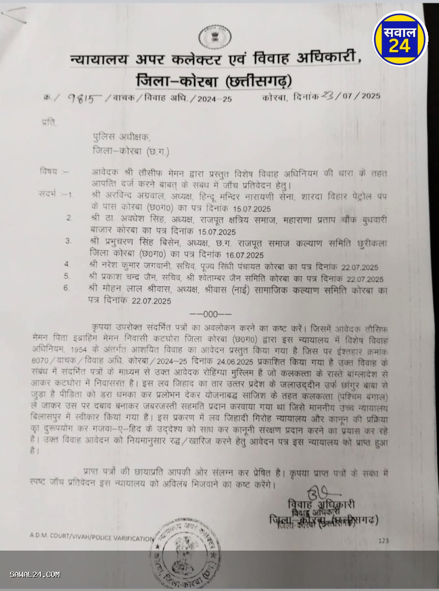 प्राप्त जानकारी के अनुसार, 23 जून को तौसीफ मेमन नामक युवक ने शोभा सिंह नाम की युवती से कोर्ट मैरिज (निकाह) के लिए आवेदन किया था। बताया जा रहा है कि तौसीफ की नागरिकता संदिग्ध है और वह बांग्लादेश से भारत आया एक रोहिंग्या मुसलमान है, जो लंबे समय से कटघोरा क्षेत्र में रह रहा है।