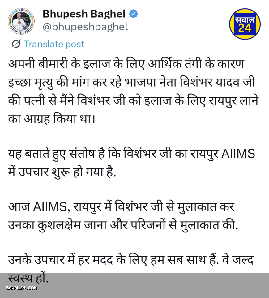"अपनी बीमारी के इलाज के लिए आर्थिक तंगी के कारण इच्छा मृत्यु की मांग कर रहे भाजपा नेता विशंभर यादव जी की पत्नी से मैंने विशंभर जी को इलाज के लिए रायपुर लाने का आग्रह किया था। यह बताते हुए संतोष है कि विशंभर जी का रायपुर AIIMS में उपचार शुरू हो गया है। आज AIIMS, रायपुर में विशंभर जी से मुलाकात कर उनका कुशलक्षेम जाना और परिजनों से मुलाकात की। उनके उपचार में हर मदद के लिए हम सब साथ हैं। वे जल्द स्वस्थ हों।"
