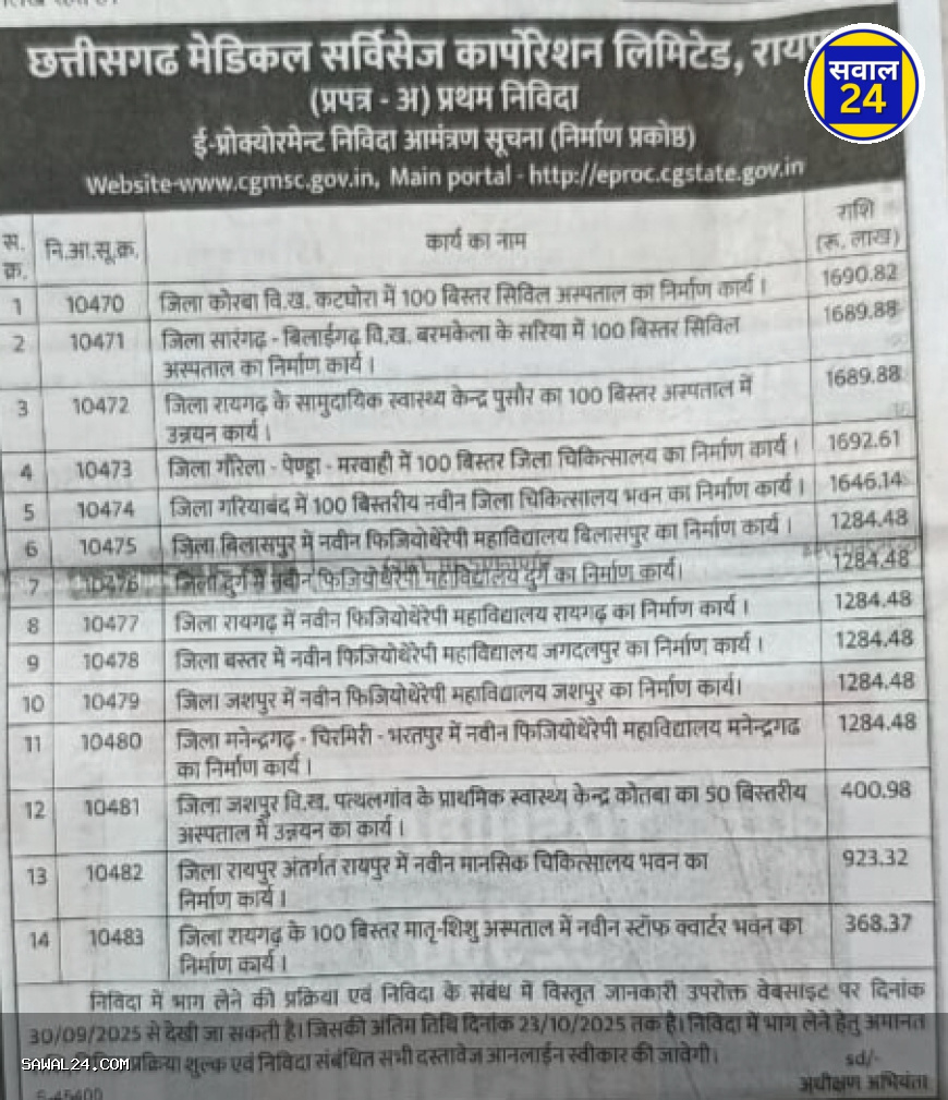 रायपुर। छत्तीसगढ़ मेडिकल सर्विस कॉर्पोरेशन (सीजीएमएससी) की ओर से हाल ही में कई करोड़ रुपए के प्रोजेक्ट्स और 100 बेड के अस्पताल निर्माण के लिए निविदा (टेंडर) जारी किए गए हैं। सरकार की ओर से इस पहल को स्वास्थ्य सेवाओं को मजबूत करने के प्रयास के रूप में प्रचारित किया जा रहा है। लेकिन, जानकारों का कहना है कि तकनीकी टीम और विशेषज्ञ स्टाफ की कमी के कारण ये प्रोजेक्ट सफल होने के बजाय भ्रष्टाचार की भेंट चढ़ सकते हैं।