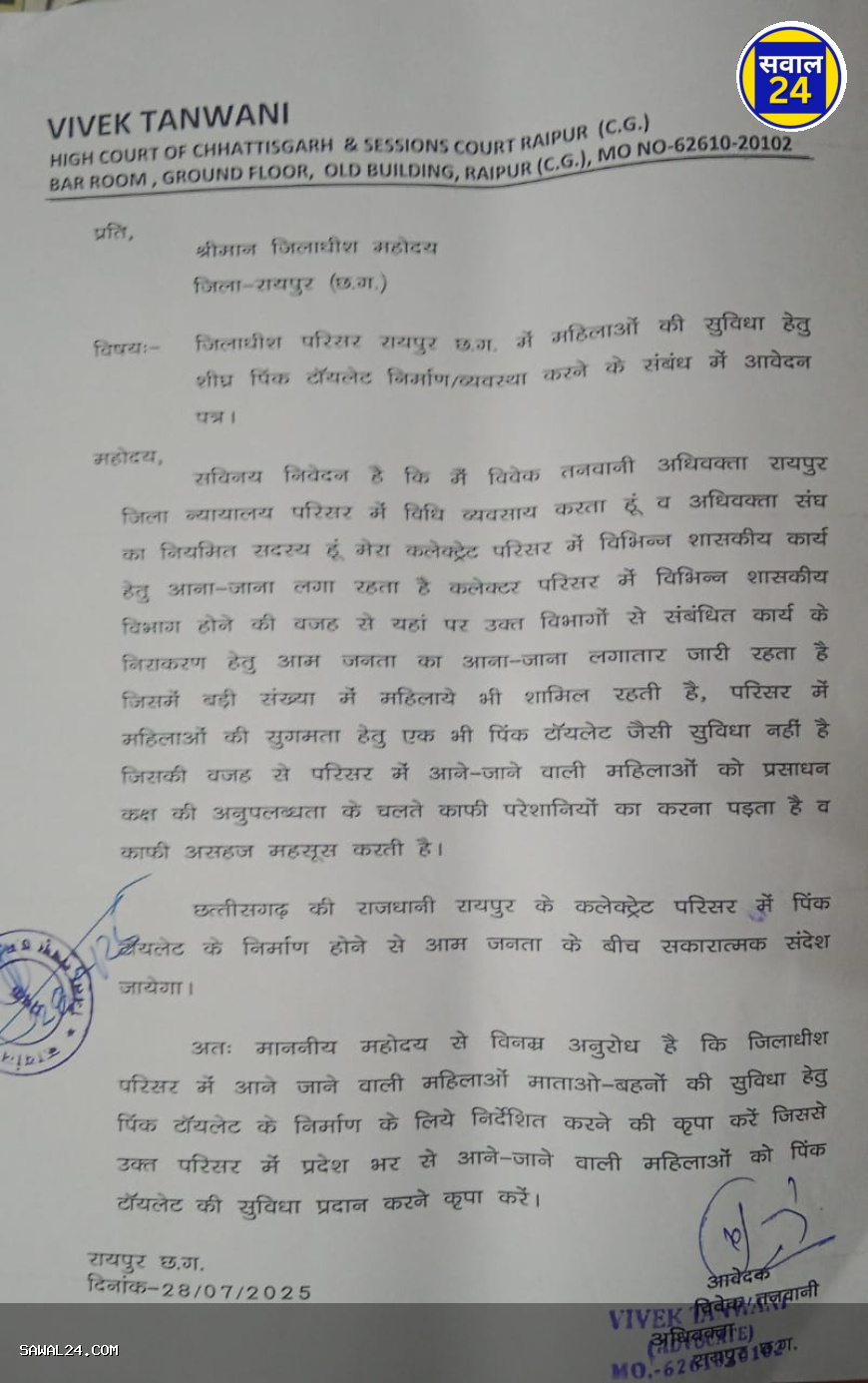 रायपुर कलेक्टर परिसर में महिलाओं के लिए पिंक टॉयलेट की मांग तेज़, अधिवक्ता विवेक तनवानी ने सौंपा आवेदन