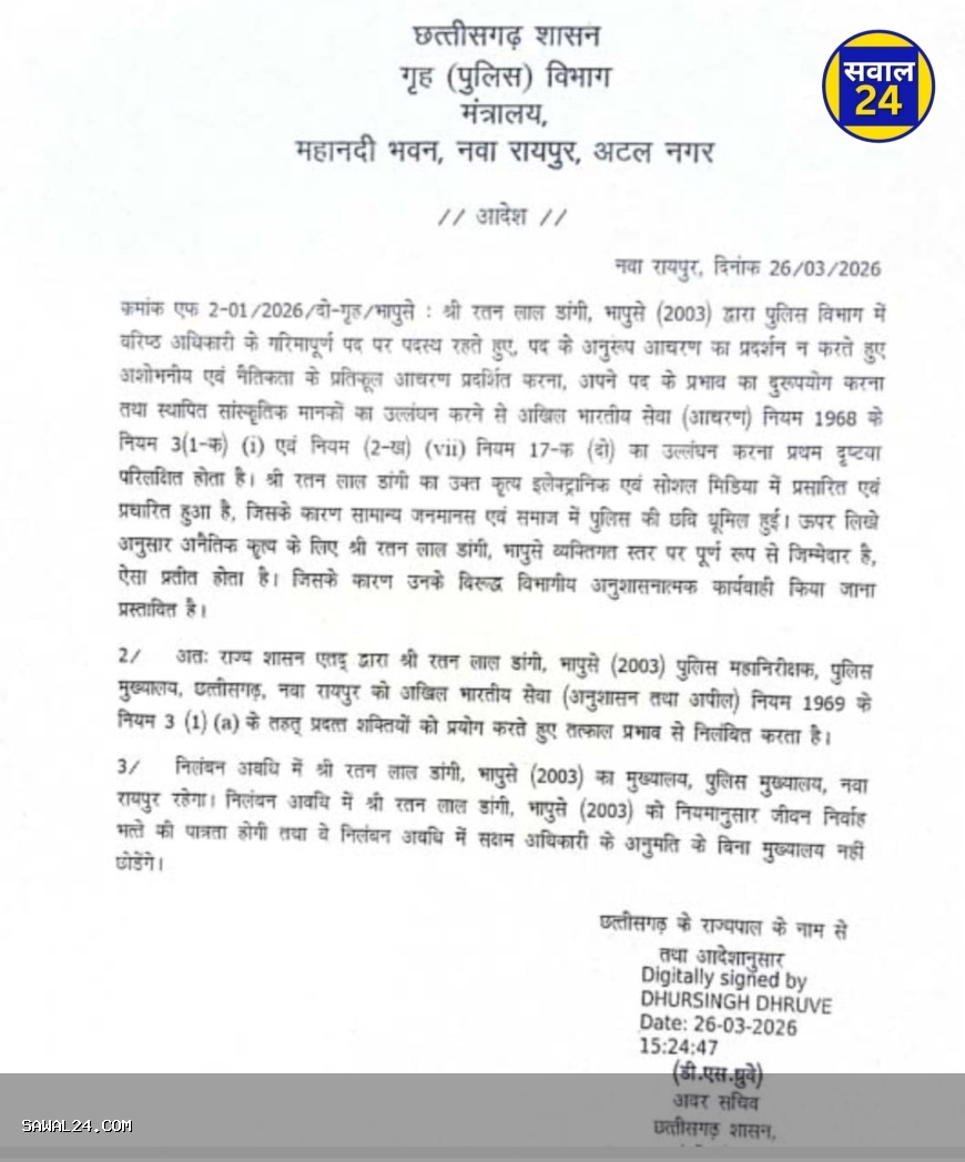 रायपुर, 26 मार्च 2026।छत्तीसगढ़ में सीनियर आईपीएस अधिकारी रतनलाल डांगी के खिलाफ यौन उत्पीड़न के गंभीर आरोपों का मामला अब तूल पकड़ता जा रहा है। इस पूरे मामले को सबसे पहले सवाल 24 न्यूज़ ने प्रमुखता से उठाया था, जिसके बाद सरकार हरकत में आई है।