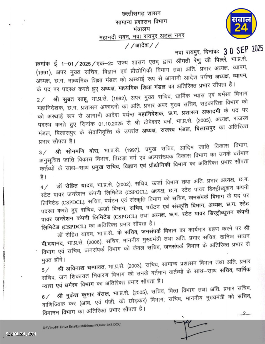 छत्तीसगढ़ में बड़े प्रशासनिक फेरबदल, 14 IAS अधिकारियों के विभाग बदले