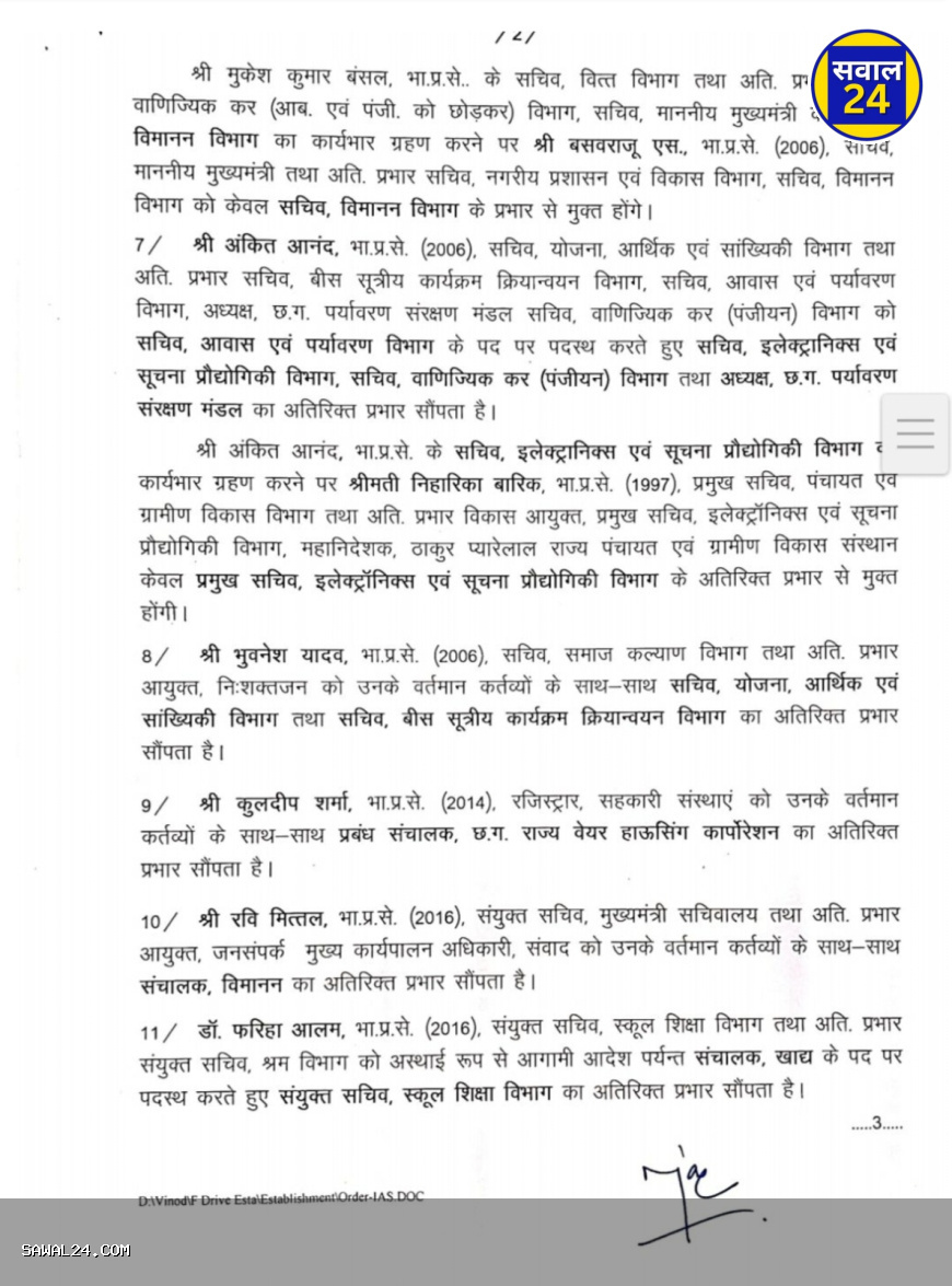 administrative reshuffle in Chhattisgarh छत्तीसगढ़ में बड़े प्रशासनिक फेरबदल, 14 IAS अधिकारियों के विभाग बदले