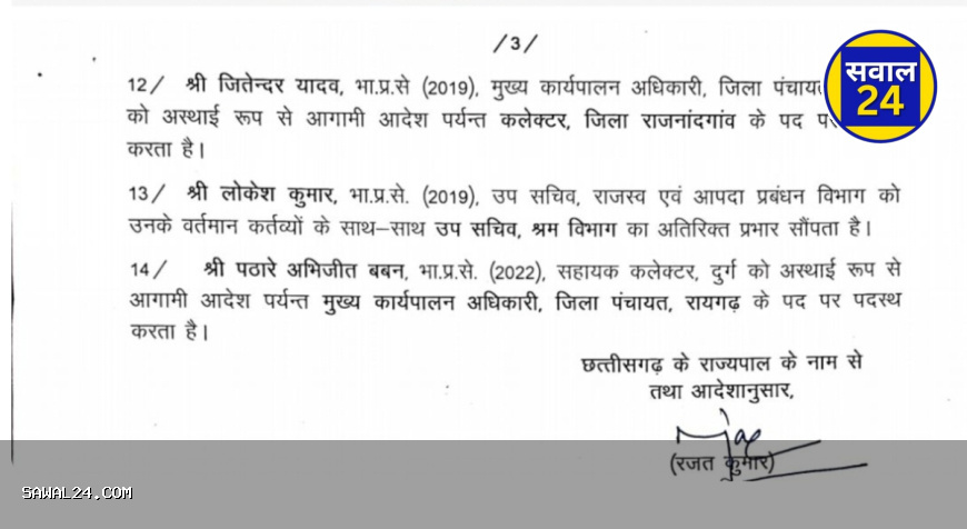 14. अभिजीत बबन पाटोरे (IAS 2022) – सहायक कलेक्टर दुर्ग से स्थानांतरित होकर रायगढ़ जिला पंचायत के CEO पदस्थ।