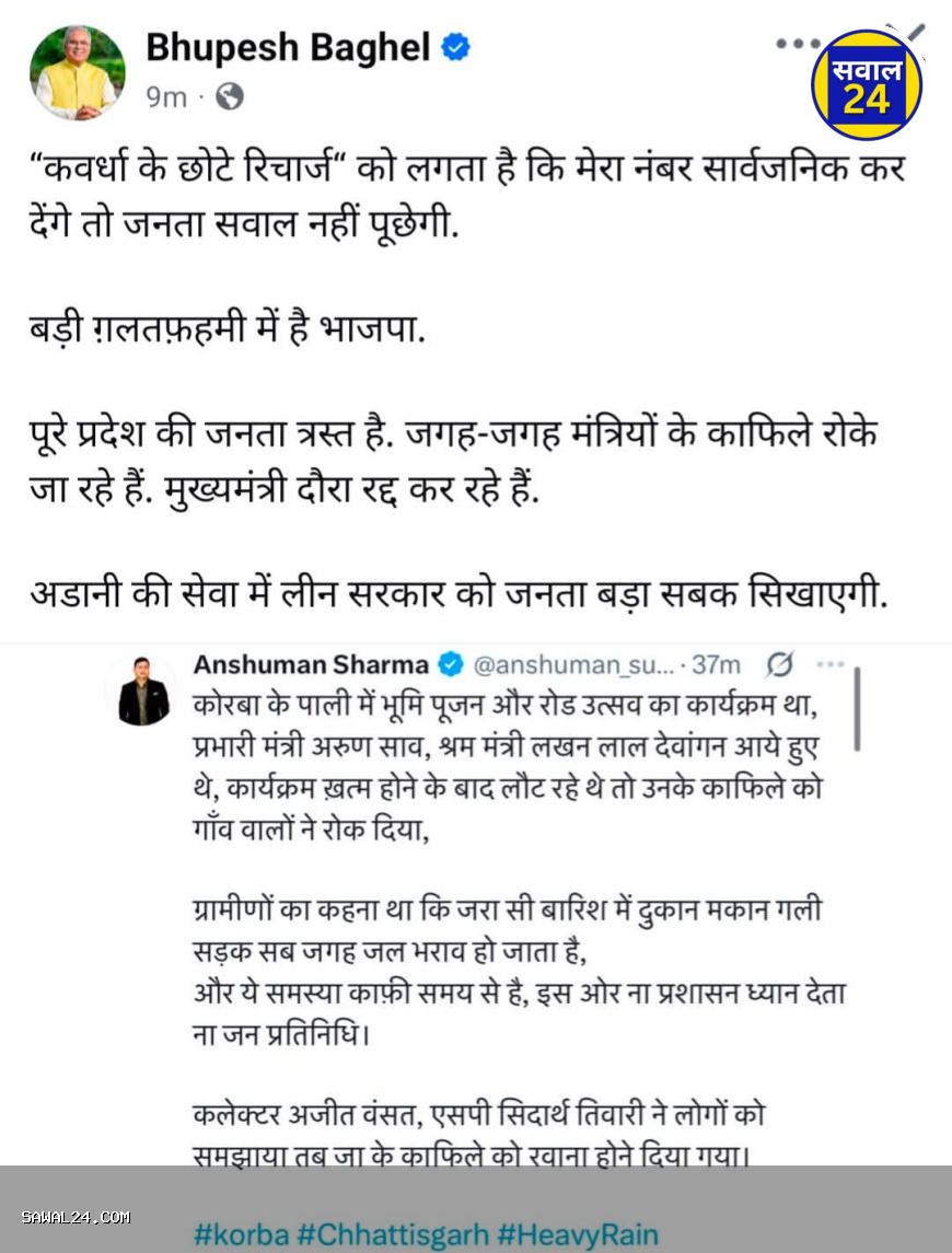 कोरबा में भारी बारिश से परेशान जनता ने मंत्रियों का काफिला रोका, भूपेश बघेल ने भाजपा पर साधा निशाना