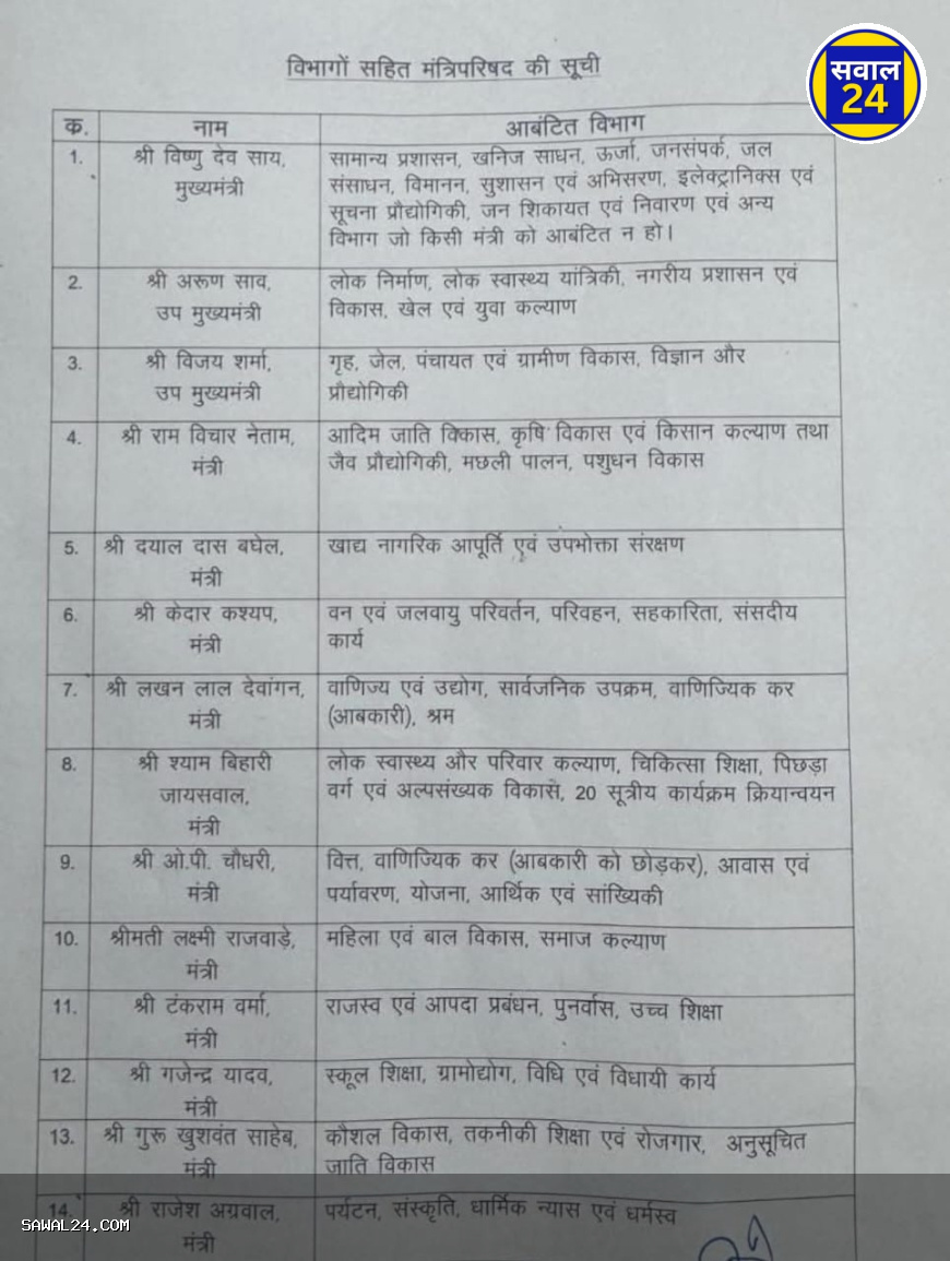 रायपुर। छत्तीसगढ़ में आज मंत्रिमंडल विस्तार के बाद तीन नए मंत्रियों ने शपथ ली। शपथ ग्रहण के कुछ घंटे बाद ही मुख्यमंत्री विष्णुदेव साय ने सभी मंत्रियों के विभागों का बंटवारा कर दिया। नए मंत्रियों को जिम्मेदारी मिलने के साथ ही अब कैबिनेट पूरी तरह सक्रिय हो गया है।