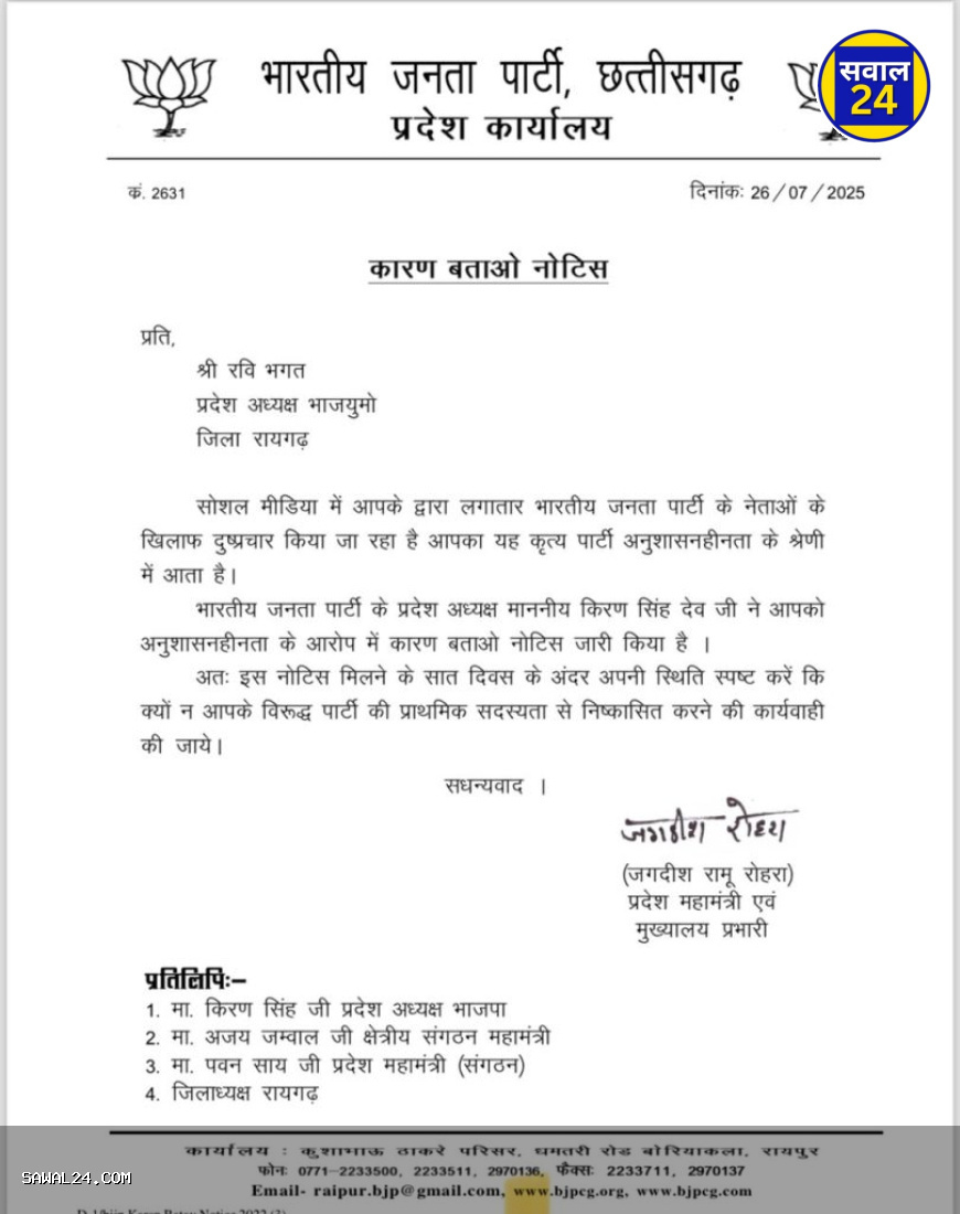 छत्तीसगढ़ लोकतंत्र में सवाल उठाना एक नेता की जिम्मेदारी मानी जाती है, लेकिन जब यह सवाल पार्टी अनुशासन के दायरे से बाहर चले जाएँ, तो इसका असर राजनीतिक भविष्य पर पड़ सकता है। ऐसा ही कुछ हुआ है छत्तीसगढ़ में भारतीय जनता युवा मोर्चा के प्रदेश अध्यक्ष रवि भगत के साथ।